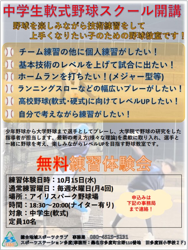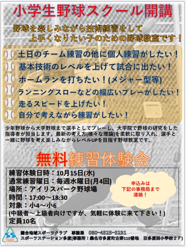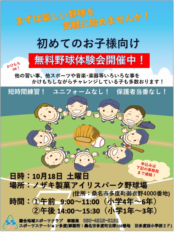 スポーツステーション多度では、10月15日(水)経験者クラス・18日(土)初心者クラスの「軟式野球 無料体験会」を開催いたします。詳しくは、下記チラシをご覧ください。